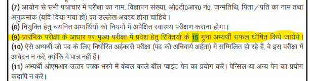 अगर देखा जाए तो मेंस की परीक्षा के लिए ज्यादा उम्मीदवार को परीक्षा देने के लिए नहीं बुलाया जाएगा ऐसा इसलिए होगा क्योंकि आयोग ने नोटिफिकेशन में ही साफ कर दिया है कि हम 15 गुना उम्मीदवार को मेंस परीक्षा के लिए बुलाने वाले हैं जो अधिक नंबर लेंगे उनकी सूची बनाई जाएगी और उसके आधार पर उन्हें बुलाया जाएगा नीचे पूरा डिटेल पढ़े।