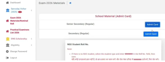 - 10वीं या 12वीं के लिए Admit Card लिंक चुनें (स्कूल लॉगिन वाले सेक्शन में)।