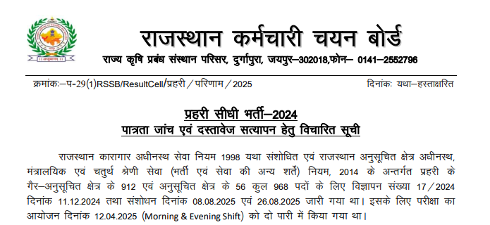 राजस्थान कर्मचारी चयन बोर्ड (RSSB) ने जेल प्रहरी भर्ती 2024-2025 का रिजल्ट अगस्त 2025 में जारी कर दिया था, और अब फिजिकल टेस्ट (PET/PST) दिसंबर 2025 से शुरू हो चुके हैं।