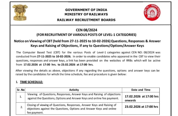 रेलवे ग्रुप डी आंसर की 17 फरवरी 2026 को शाम 5:00 बजे लिंक एक्टिवेट हो जाएगा सभी उम्मीदवार नीचे दिए लिंक से चेक करें डायरेक्ट लिंक है सबसे पहले खुलेगा क्योंकि करोड़ उम्मीदवार सर्च कर रहे थे अब उनका इंतजार समाप्त हो चुका है।