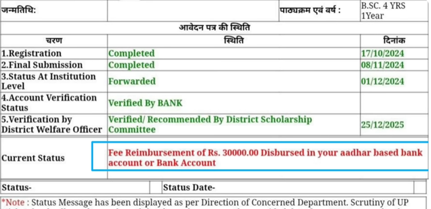 आपको याद होगा 2024 और 25 वाले उम्मीदवार को भी इस फर्स्ट इंस्टॉलमेंट पेमेंट डिप्टी में पैसा भेजा गया है योगी जी के द्वारा इसलिए आपको इन बिंदुओं का ध्यान में रखते हुए अपना सामान्य ओबीसी एससी एसटी और अल्पसंख्यक वर्ग के उम्मीदवार को छात्रवृत्ति का नया वाला लेटेस्ट स्टेटस चेक करना होगा जैसा कि यहां पर आपको एक डिटेल फोटो में दिया गया होगा बिल्कुल यह वाला स्टेटस अगर आपका चेक हो गया है नीचे यह लिंक से तो आपके लिए खुशखबरी है।